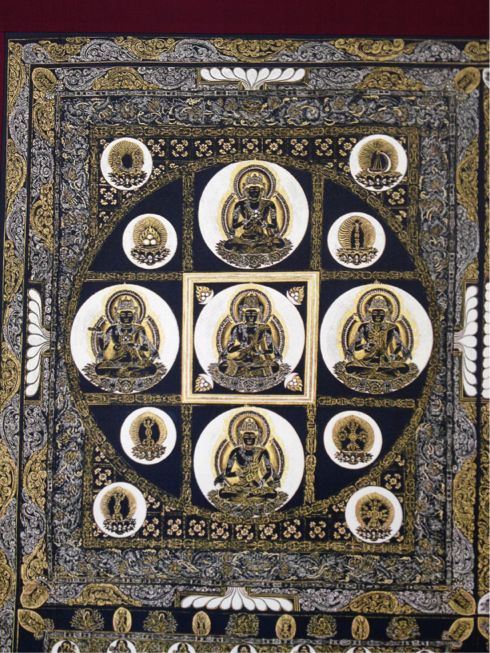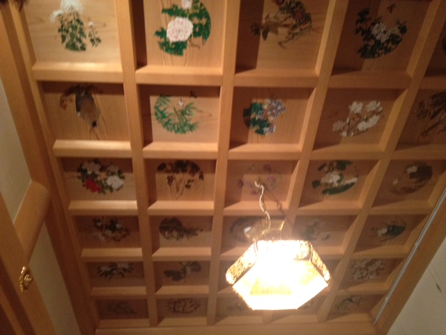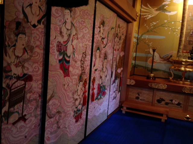 阪神大震災の被害にあった本堂内の襖絵や天井画等が、香美町小代の書家・橋本龍邨氏の手によって復元されているところでした。新しい建物に色彩が映えています。